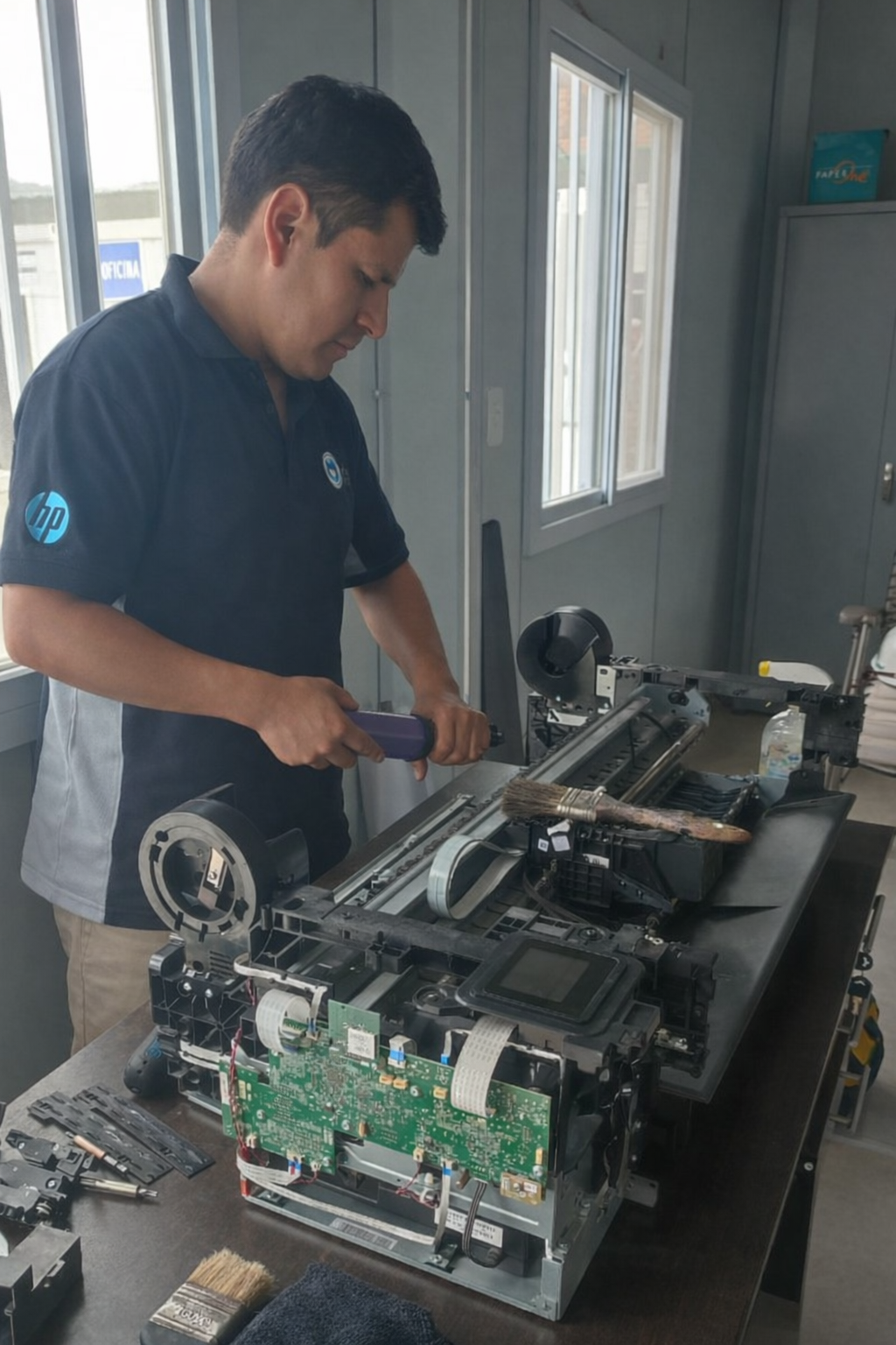 Durante el servicio se desmontan e inspeccionan componentes críticos, se realiza limpieza interna detallada, lubricación de ejes y mecanismos, mantenimiento de la Service Station, revisión de módulos electrónicos, sensores, sistema de arrastre de papel y calibraciones necesarias. Si durante el proceso se detecta una falla menor que puede corregirse en el momento, se soluciona de inmediato. Si se identifica un componente con desgaste próximo a fallar, se informa al cliente con criterio técnico antes de que el problema genere una parada inesperada.